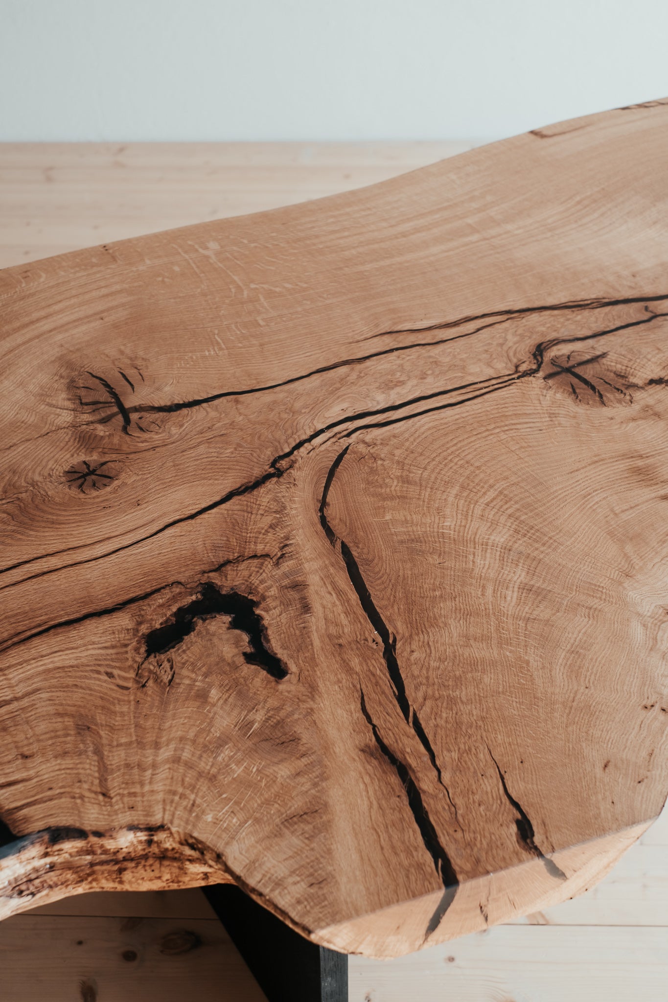 je viacero možností ako spevňujeme praskliny v dreve vzniknuté prirodzene alebo sušením. V prvom rade sa snažíme vyberať drevo bez poškodení, nie je to však vždy možné preto na vyplnenie drobných praskliniek využívame epoxidovú živicu čiernej, sivej alebo transparetnej farby. Tiež na požiadanie vieme do dreva zapracovať spájacie drevené motýliky alebo oceľové "kostičky".